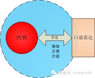 最后放图。图1中可以看到三大模块的逻辑关系。最大的圆代表每个人感知到的世界。红色的圆形代表内核,矩形代表口语表达,即上文提到的两个部 分。这有点像操作系统的内核模式与用户模式:P。管道是内心与外界沟通的方式,我们需要显式地处理内核的输出,以保证口语表达的得体、合理、合适。如果对 比我前面提出的三个问题,你会发现我重点对应到内核与口语表达模块。那管道呢?我会在翻译口译部分详细论述。